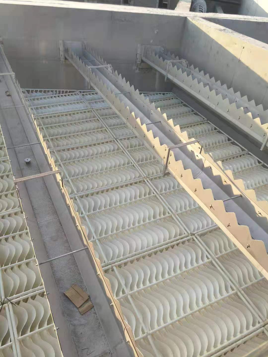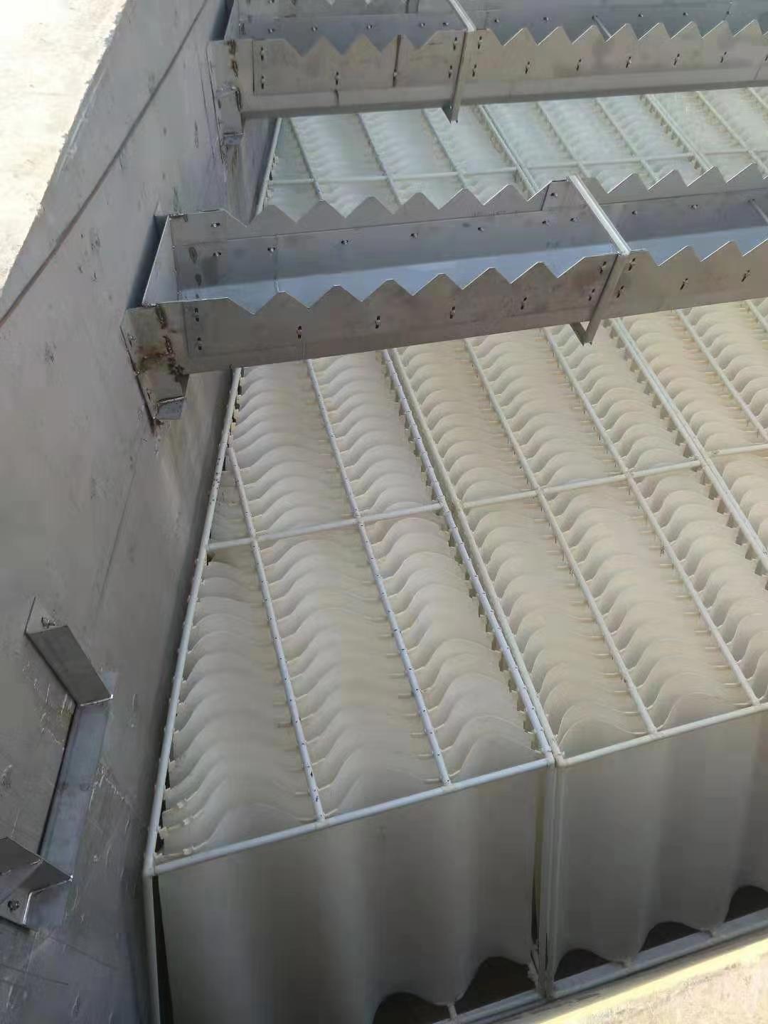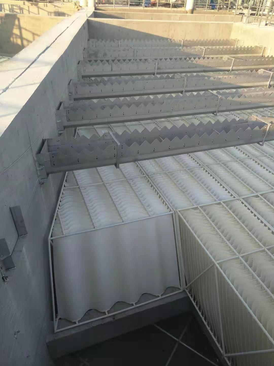 白龙港污水处理厂提标改造工程BLG - E4 标100万吨/日、BLG - E6 标除磷池系统25万吨/日。采用高效沉淀池混合、絮凝和沉淀工艺。澄清区斜板泥水分离为框架式波形斜板沉淀器。白龙港污水处理厂提标改造工程BLG - E4 标段高效沉淀池构筑物平面为直角梯形。为保证框架式波形斜板箱与池型完全吻合,没有短流区。2026世界杯公司研发了棱形直角梯形框式斜板箱。为国内创新。满足了白龙港污水处理厂三期提标改造工程直角梯形高效沉淀池的处理功能要求。